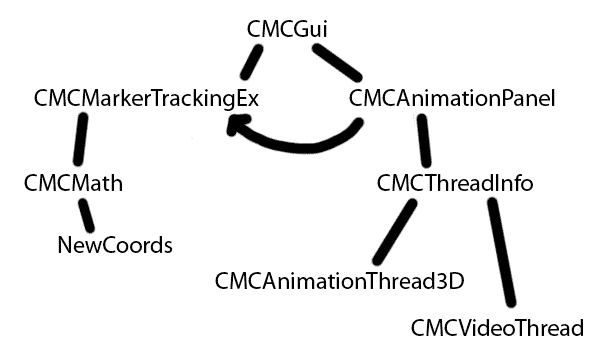 The frames from the video cameras are analyzed by CMCMarkerTrackingEx, which located the points in each frame, orders them appropriately, then calls CMCMath to determine the real-world locations of the tracked points. CMCMath uses camera rotation matrices and translation vectors calculated by the Mathematica NewCoords notebook. CMCMarkerTrackingEx then either saves the tracked points, frame by frame, to an out.text file, or passes the points immediately to CMCAnimationPanel.