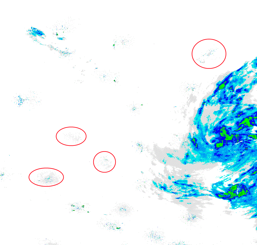 The original image is similar to any old radar image you could find on weather.com, however, it has a lot of junk floating around. The stuff that has been circled are examples of junk that will be removed in the next step. Grey pixels and sprinkled pixels are perfect examples of junk; they could be anything: birds, clouds, leaves, maybe even drizzle but it can all throw our prediction off