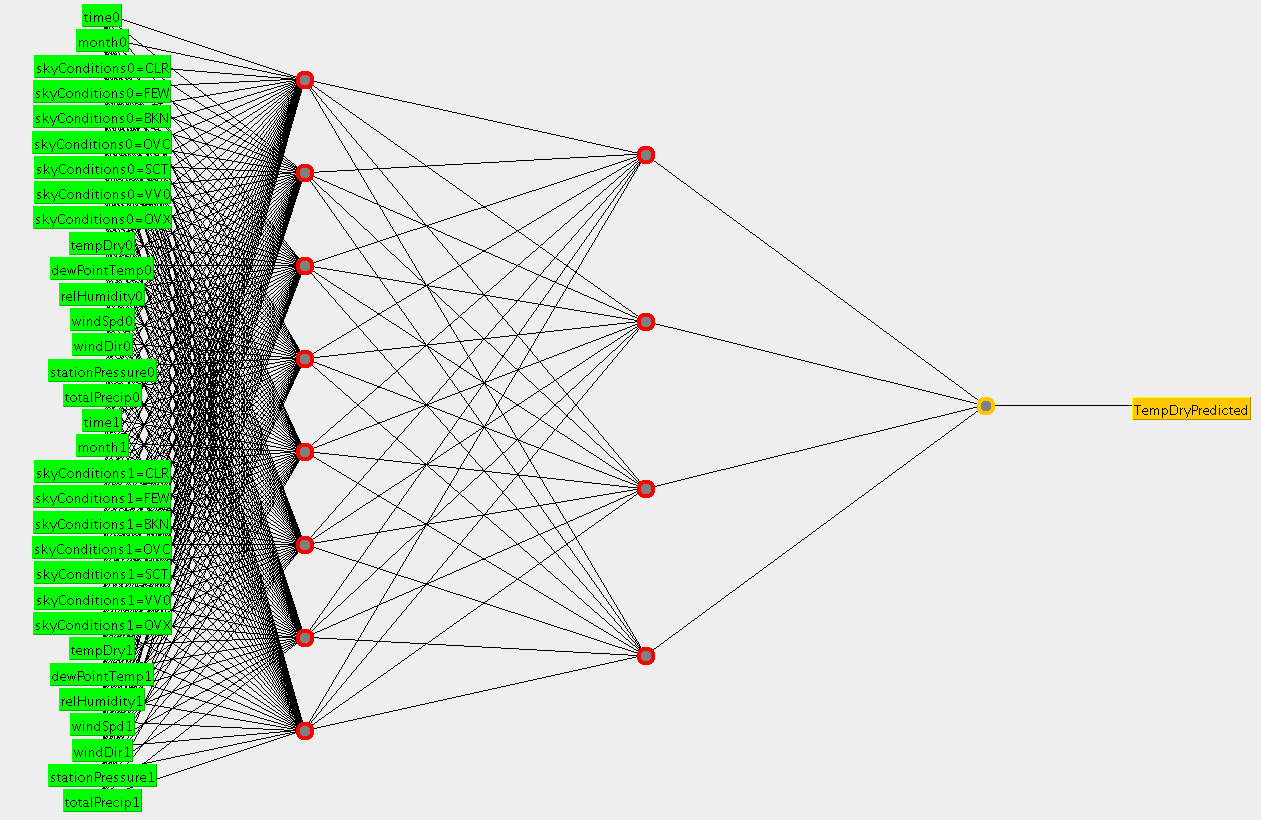 Using WEKA, a machine learning toolkit, we were able to create a neural network to predict each of the next hours weather conditions. Using these predictions, and the previous weather conditions, we were able to extrapolate to get the weather conditions for multiple hours in the future.