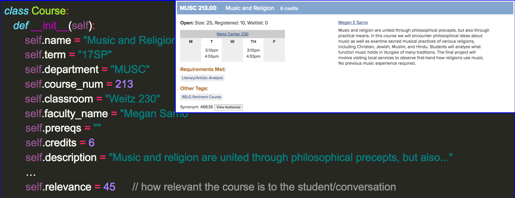 The functions that rely on this organization are functions like query_by_keywords and query_by_distribution, where the order of the returned courses has the ability to define what courses the user will look at in a possibly enormous selection of results. The construction of these course objects happens in a helper function called fill_out_courses, which uses the returned SQL query results, and simply fills out the corresponding information in the course object. The actual organization of these courses relies on another helper function called calculate_course_relevance, which assigns a score to the weighted_sum attribute based on the diversity of keywords that occur in the title and description, the total count of keywords that occur, the department the course exists in, and the other interests that the student has previously mentioned, passed to us as student_interests. Query_by_distribution doesn’t have a list of keywords as input, so instead, the Dialogue Manager passes previous interests, and those are used as keywords to adjust the order of the courses returned.
