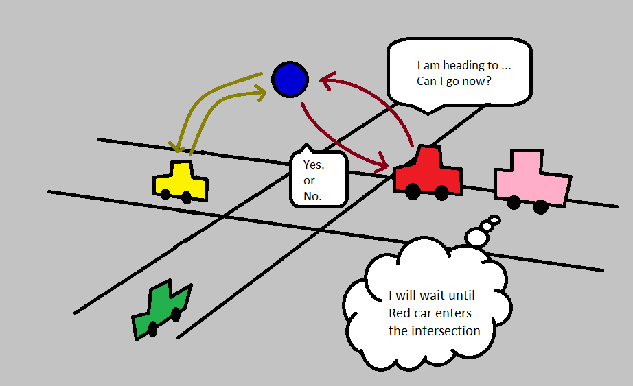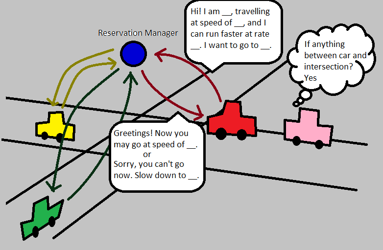 Protocols for reservation: when at certain distance and no cars ahead waiting (use lidar to detect), cars will tell manager their IDs, position, speed, acceleration, and direction. Manager will tell cars if they can enter the intersection and the sped they should drive at.