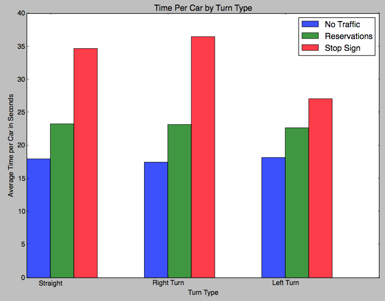 To determine how efficient our reservation algorithm is, we compare it with optimized (no traffic) itersection and stop sign intersection. We ran the simulations for wo minutes 10 times and took the average of data.