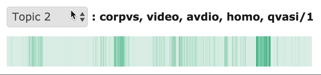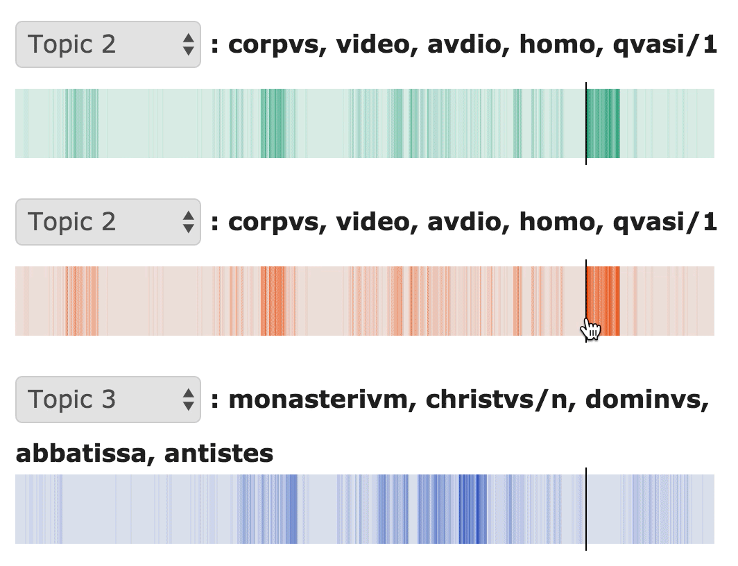 The heatmap tab of Loquela displays three different heatmaps, allowing the user to directly compare the prevalence of three topics over the course of a corpus. The darkness of the bar at any point represents the number of words assigned to the selected topic in that area of the text.