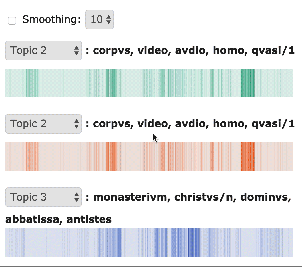 Turning on smoothing enables a horizontal blur, which allows the user to inspect the more general trends of topic prevalence. The dropdown allows the user to select blur radius in pixels.