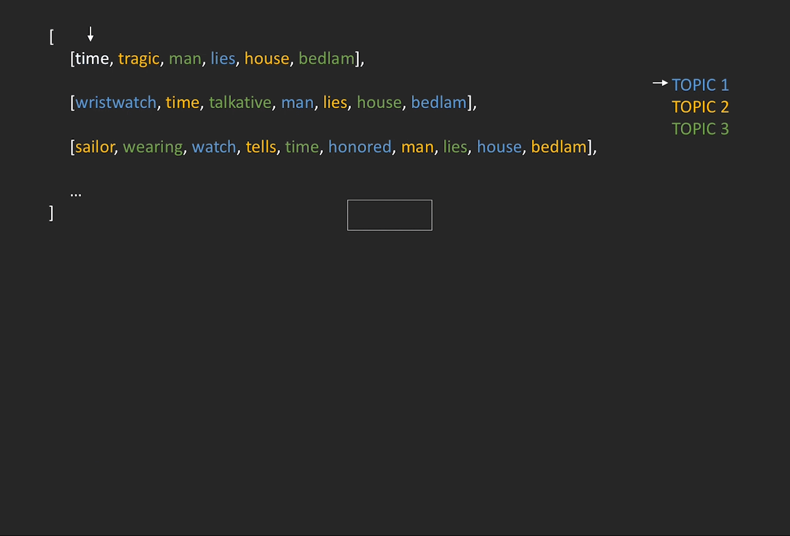 The word is then assigned the newly-determined topic and re-integrated into the corpus. Appropriate topic assignment tracking variables are likewise updated, and the next word in the corpus is de-assigned.
