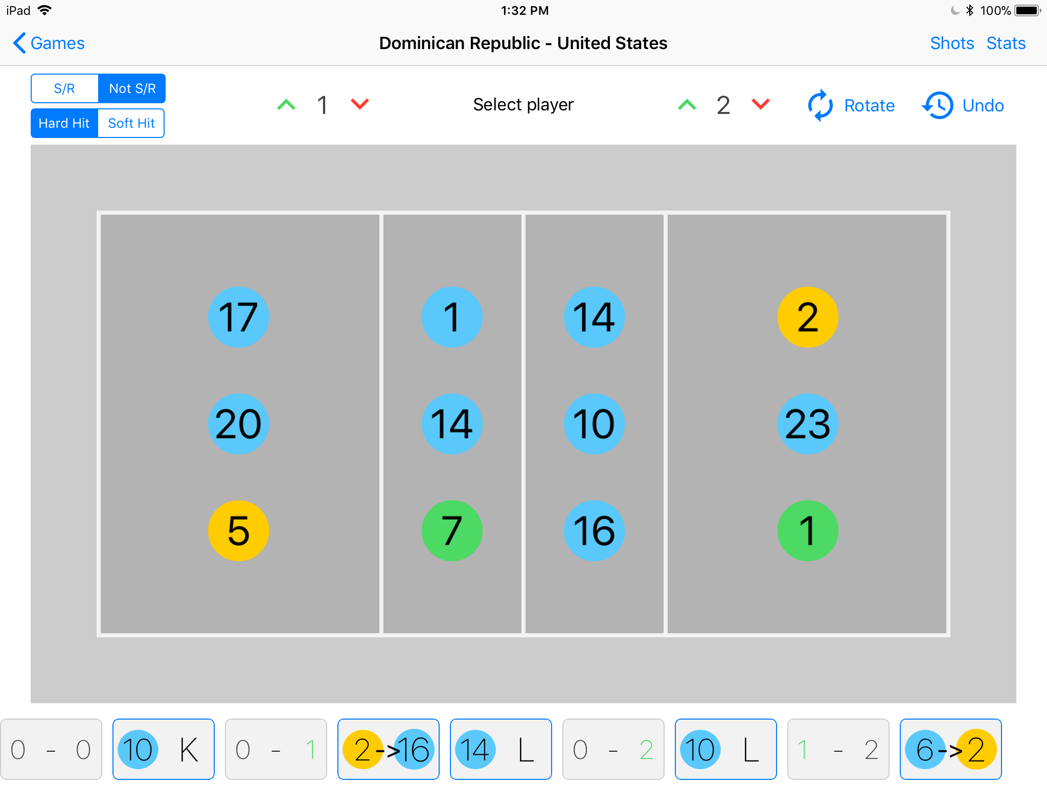 Shottey provides a clean and efficient interface for volleyball shot tracking. After selecting a player everything disappears except for the player's previous shots which are displayed in gray.
