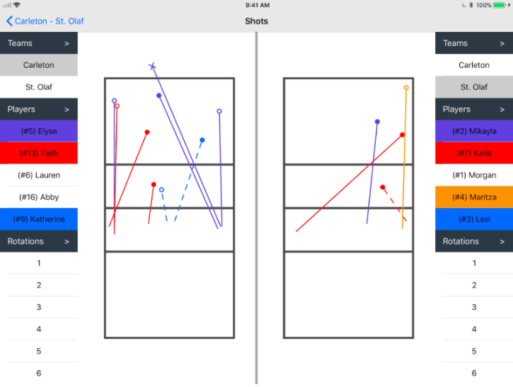 Volleyball is a complex, fast-paced sport that involves a large volume of statistics which can be recorded in real time during games. Currently, Carleton’s varsity women’s volleyball team has four people, two assistant coaches and two student managers, devoted to recording different statistics on paper at each game they play. To convert these statistics into a more readable format requires extensive post-game work, meaning that the team gets little in-game value from the data. To fix this we developed an iPad app which allows coaches to quickly log hits, process the statistics automatically, and create informative visualizations.