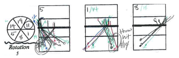 At the D-III collegiate level, many stats are taken about the performance of both opposing teams and one’s own team. Most of this data is taken by hand--some mid-game, some while watching film after the fact--and must then be later collected, aggregated, and analyzed (see an example below). As such, it is very difficult for coaches to make decisions based on this data in the moment--to act upon it when it is most relevant. Interactive tools for data collection, analysis, and presentation could change this.