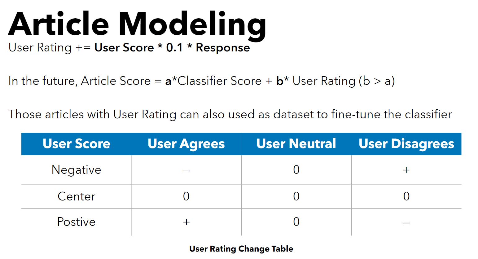 Once we have the user score, we now consider how to model the article bias using numerical value. The first thought is easy, we just use number to represent the classification result -- namely 1 for Right / 0 for Center/ -1 for Left. But that is not enough, here is the reason: Recall we have a text classifier with 85% accuracy, it sounds good at first but if you do the math, this means one of seventh of our prediction labels are wrong, which is not ideal. Moreover, if we take a close look at the baseline, we found out that the prediction accuracy of Center Article is much lower than other categories. Which kind of makes sounds -- even for us, it is a hard task too. how can we classify center article, given that we all have our own bias. How can we deal with these problems? Besides the classifier score, we introduced a new term User Rating that takes accounts of the user responses. Here, only the experienced users with Response History bigger than 10 can affect the user rating, because the new user has not form a clear stance yet as their scores may be jumping round at the early stage. We then combine the User Rating with classifier score to produce the Article Score. Moreover, this helps us to classify Center article too, as we believe the “Center” articles should have roughly same number of agree and disagree from both sides of users. To be more specific, the formula is User Rating += User Score * 0.1 * Response, as also shown in this table below. For example, a user with negative score agrees with a article, the user rating of this article will decrease. Right now, the weight of classifier score and user rating are the same, namely 1. In the future, as we have more users, we can increase the weight of User Rating and rely more on the response of users. Moreover, we can use those articles with User Rating as dataset to fine-tune the classifier. Eventually, we will have better and better results.