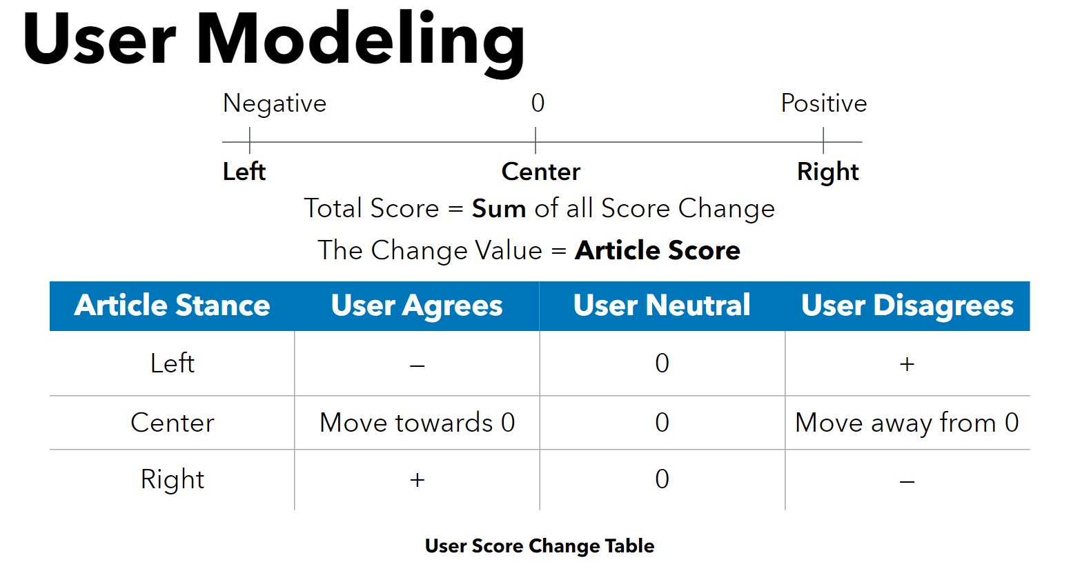 The first step is to set direction such that Negative = Left/0 = Center/Positive = Right. Next, we define a score change according to all possible conditions show in this table. For example, if a user agrees with Left leaning article, the score change will be negative. Most importantly, when a user agrees with Center article, the score change will move towards 0. In the end, the total score is the sum of all Score Changes and each change value is the article score(see Article Model for more detail). However, we can not just use the total score to represent the political stance, since those users who read more will get larger score. So we use Global User Score, which is simply Total Score / Length of Total Responses, to represent the overall user stance.