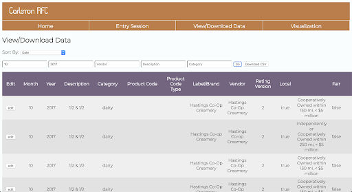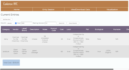Throughout Fall 2018 and Winter 2019, our team worked with the Carleton campus student group, the Real Food Calculator, to improve their workflow. Twice a year they record all of Bon Appetit’s purchases and calculate the percentage of items in the Carleton dining hall that are real as defined by the national Real Food Challenge. Ultimately, we aimed to help them more efficiently and effectively meet their goal of shifting institutional spending from conventional to “real” food. After informally interviewing them about their process and observing their work sessions, we decided to create a website and database system to help ease the process of data entry and to visualize food purchasing trends. On the data entry portion of our website, we improved their data entry process by reducing redundant researching and typing. On the visualization portion of our website, we have provided graphical representations that allow RFC volunteers to get a general idea of the real food scene at Carleton and to identify which specific products are most beneficial to shift from conventional to real. Overall, our tool will allow the RFC at Carleton to spend less time entering data and more time and effort increasing the total real food percentage at Carleton. More Info