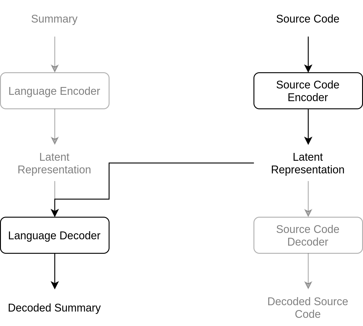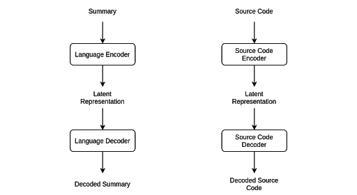 In order to properly learn this latent representation the BVAE needs an encoder and a decoder for source code and a similar pair for natural language. This results in two semi-distinct neural networks which use KL-divergence loss to keep their latent representations similar, as pictured below.