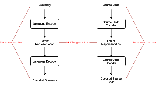 Now, all neural net models need loss in order to learn, and this particular model uses two kinds of loss. Loss is herein calculated both through comparison of decoded summaries/code snippets to their original versions that were encoded (Reconstruction Loss) as well as comparison of the latent representations of encoded code/summary pairs (KL Divergence Loss). Through inclusion of both of these loss metrics, the model can sufficiently learn encoding methods that can correctly decode into either input format. Again, technical details on this functionality are given in the implementation section.