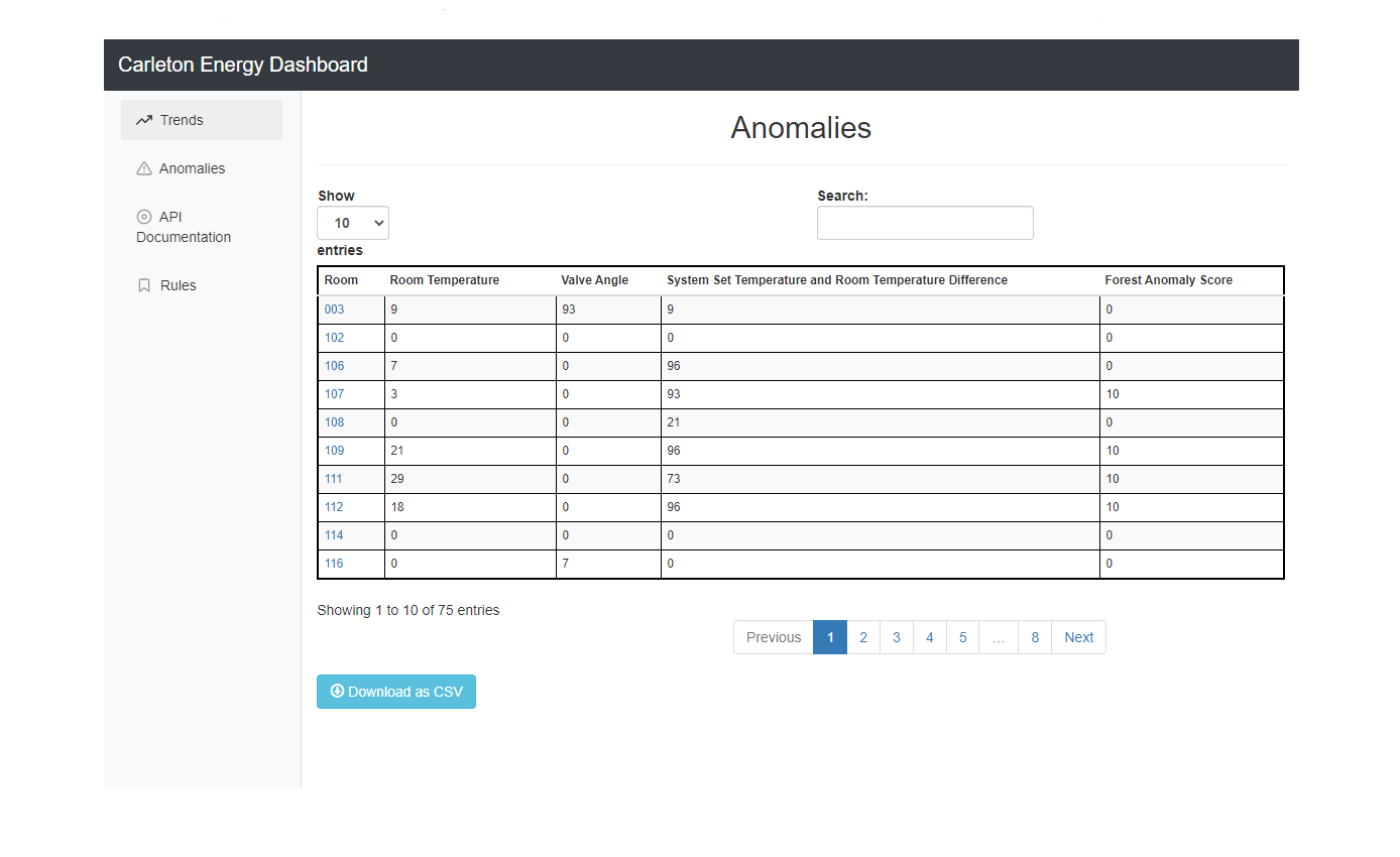 Carleton's energy facilities supply us with vast amounts of data on the devices that heat, cool, turn on/off, and much more on Carleton’s campus. Well-applied Energy Analytics techniques could help the Facilities Department automate the detection of problems that would assist Carleton in reaching its goal of Carbon Neutrality by 2050. In this project, we explored anomaly detection techniques such as Seasonal Trend LOESS decomposition, Heuristic models, and Isolation Forests to detect anomalous device behavior. We also laid the groundwork for future teams to expand on our analysis and collaborate with other teams by improving the documentation of the API using Postman, as well as standardizing the database according to the Brick naming standard.