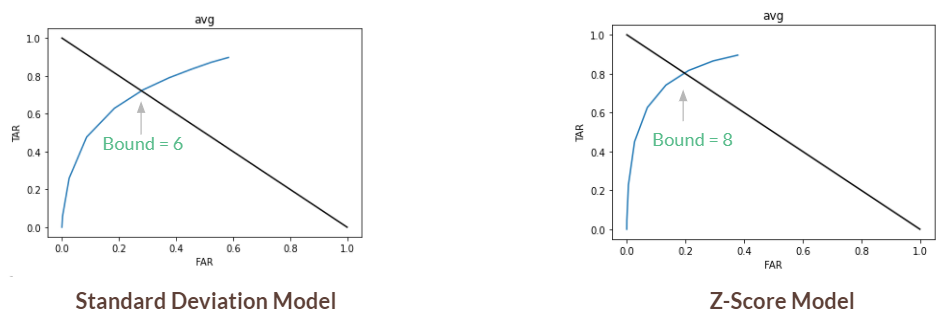 3. We then compared these losses against our 11 bounds (0 - 10) to construct ROC curves (Figure 2). If the loss is below a bound, we accepted (TA or FA). Otherwise, we rejected (TR or FR). The most important information we got from this first step is the optimal bound, which is when TAR (true acceptance rate) + FAR (false acceptance rate) = 1, EER. In our tests, the optimal bound was 6 for the standard deviation model and 8 for the z-score model.