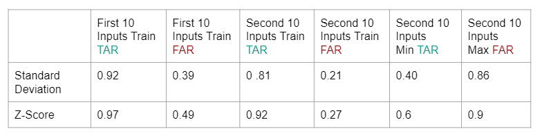 We also noticed that our results match our speculation about the z-score model and how Stouffer’s approach would improve model results. Since we accepted users based on all z-scores, and this balanced out some of the approximated ranges for our identifier, we could say that the standard deviation model is a bit stricter in terms of accepting ‘true’ users compared to the z-score model. As a result, the z-score model shows a better TAR but sometimes shows a larger FAR, a maximum of 0.9 even.