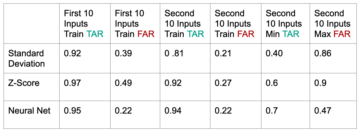 While the standard deviation based models had difficulty when training on the first 10 inputs compared to the second 10, the neural network model performed similarly well when using both the first and second 10 inputs as training. It also performed better on the worst users, who likely had the least consistent keystroke dynamics. While there are many possible explanations for this, one reasonable explanation is because the neural network model was able to wholistically look at the input password and pick up on patterns spanning many keystrokes while the statistical models looked at each keystroke individually without the context of surrounding keystrokes.