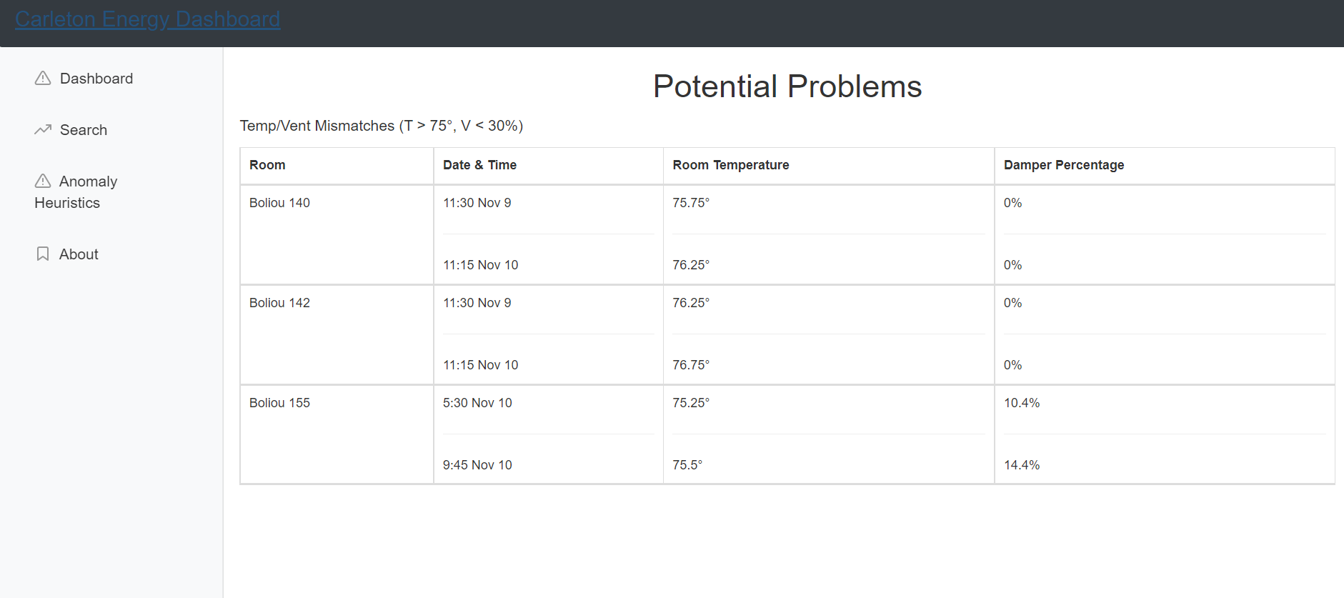 For Data Management, we implemented an automated process to store and archive energy data for each month. For the API, we wrote new commands to query the database based on the type of anomaly that is being searched. For the Website Interface, we added a new Heuristics and Dashboard page. The Heuristics page enables the user to play around with the temperature and damper percentage values, the building, and date range, and then search for points that meet the inputted criteria. The Dashboard automates this process each time the website is refreshed with hardcoded values.
