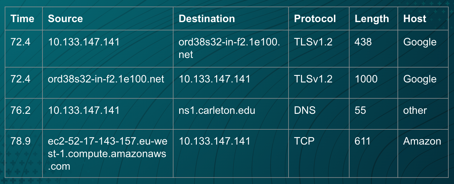 Wireshark can also get us information on the addresses from which data is being received or sent to, as well as the size of the packets in bytes. It has many other features, including port filtering and conversion to .csv, which is how we later performed the majority of our data visualizations.