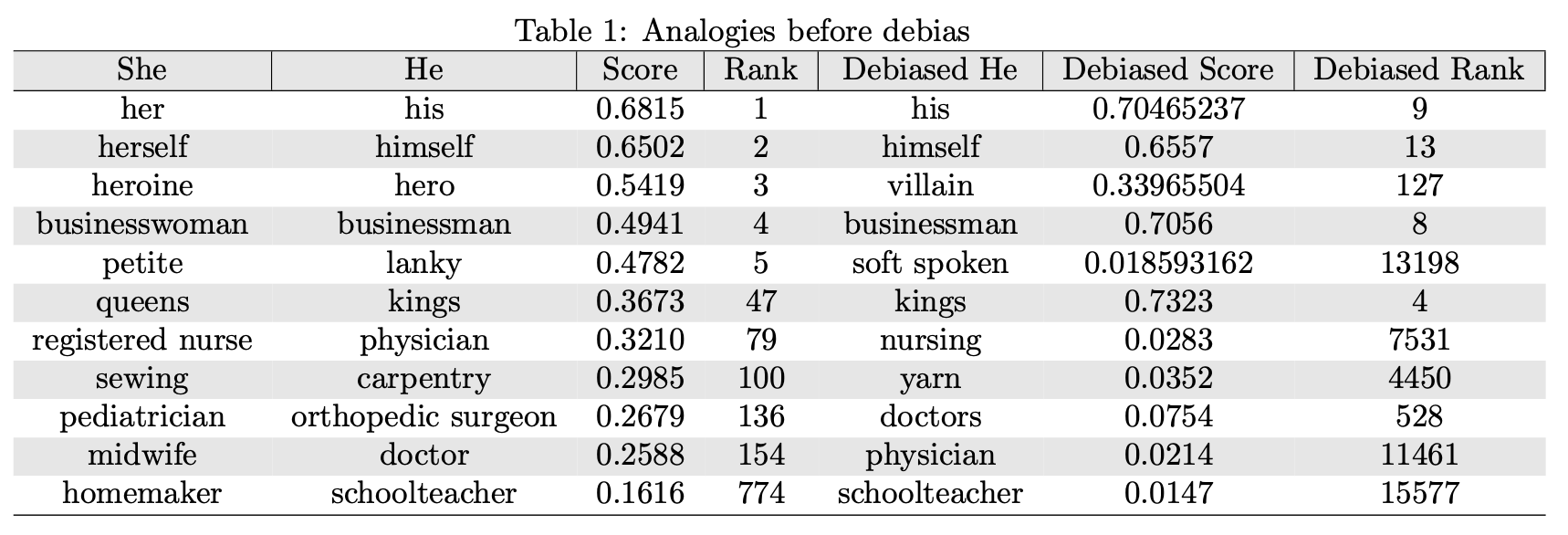 We spent our term replicating the research conducted in the 2016 paper produced by Bolukbasi et al. titled, “Man is to Computer Programmer as Woman is to Homemaker? Debiasing Word Embeddings”, where that team aimed to expose the implicit gender biases found in the way that we use our language through word embeddings and to also determine whether a soft or hard debiasing algorithm would be more effective in eliminating that gender bias within word embeddings.