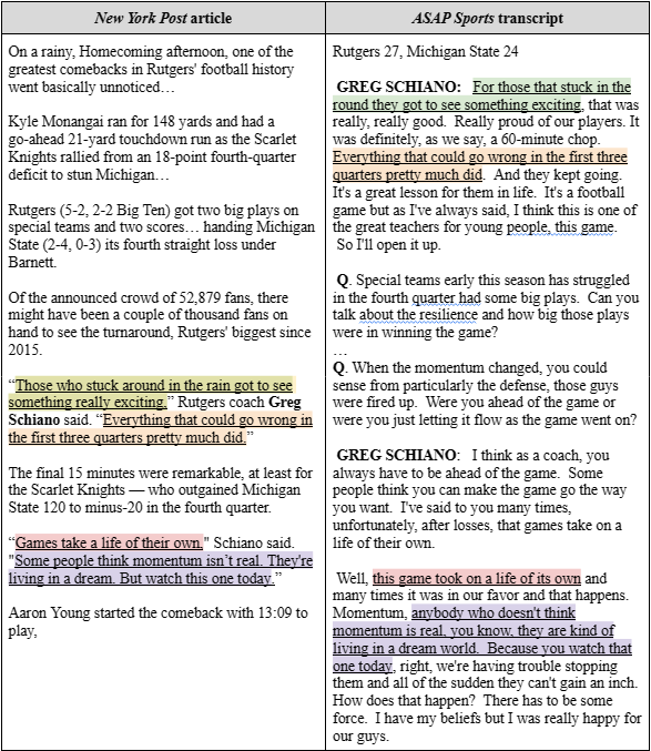 We want to quantitatively determine if quotes from athletes or coaches are taken out of their original context. Since context can mean tons of different things, for this project we defined transcripts as the context to quotes found in articles.