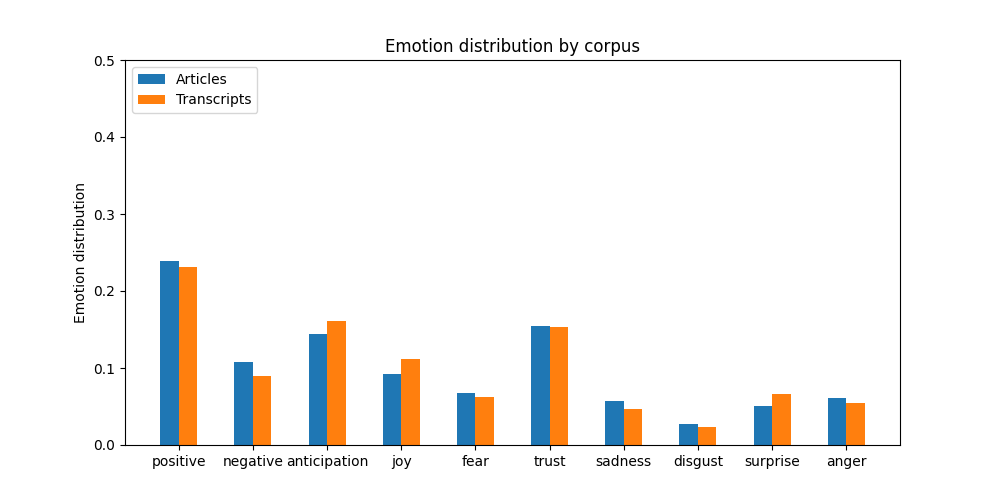 Below is a picture comparing our general findings from sentiment analysis. While articles have a higher percentage of both general positivity and negativity, when we look at the percentage of individual emotions, we see that articles have higher percentages of negative emotions and lower percentages of positive emotions.