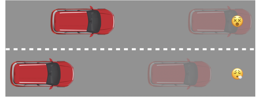 A number of different approaches have been developed. One, for instance, suggests that the agent should "imagine into the near future" so that it can consider what might happen and avoid it (Thomas, Luo, & Ma 2021). Below, an image from that paper shows that in the top scenario, it's too late for the top car to brake and avoid hitting the emoji pedestrian, but in the bottom image, the car still has enough time to act, if it can only recognize that it needs to do so by "imagining" what might happen in several seconds: