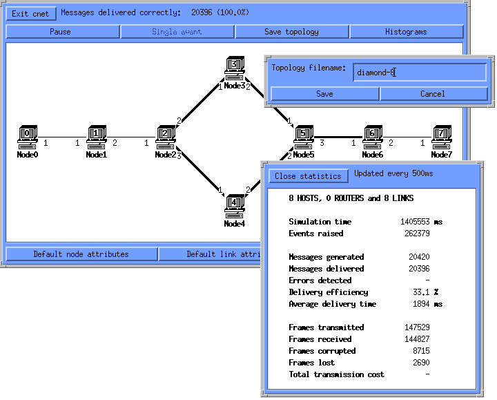 Here we see an eight node simulation under execution. Some of the links appear thicker than others as they have recently carried more traffic. The global statistics window is being displayed and we can see that because of the relatively high number of corrupted and lost frames (resulting in re-transmissions), that the delivery efficiency is quite low. Another text-entry window has also been requested so that we may save the current topology to the indicated file. At present, the screen dumps presented here were taken of cnet (v1.3).