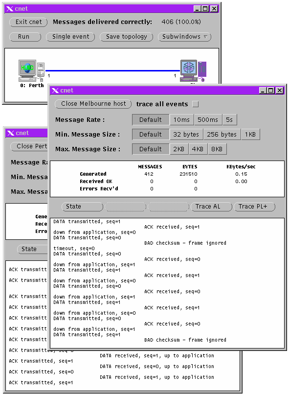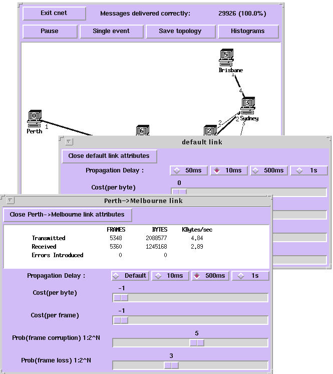 Here two subwindows have been selected to compare a specific set of link attributes with the global (default) link attributes. Both global and specific link attributes may be modified, while the simulation is running, by clicking buttons or dragging sliders. At present, the screen dumps presented here were taken of cnet (v1.3).