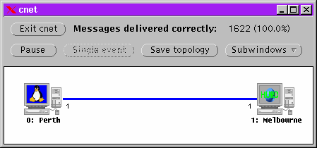 This is the typical starting representation of a two node simulation, perhaps implementing the stop-and-wait protocol. The simulation is currently running but we could pause and then single-step through our protocol using the buttons. A total of 1622 messages have so far been delivered, and the Application Layer has not been presented with any ``incorrect'' messages. Our protocol is thus reported as being 100% correct.