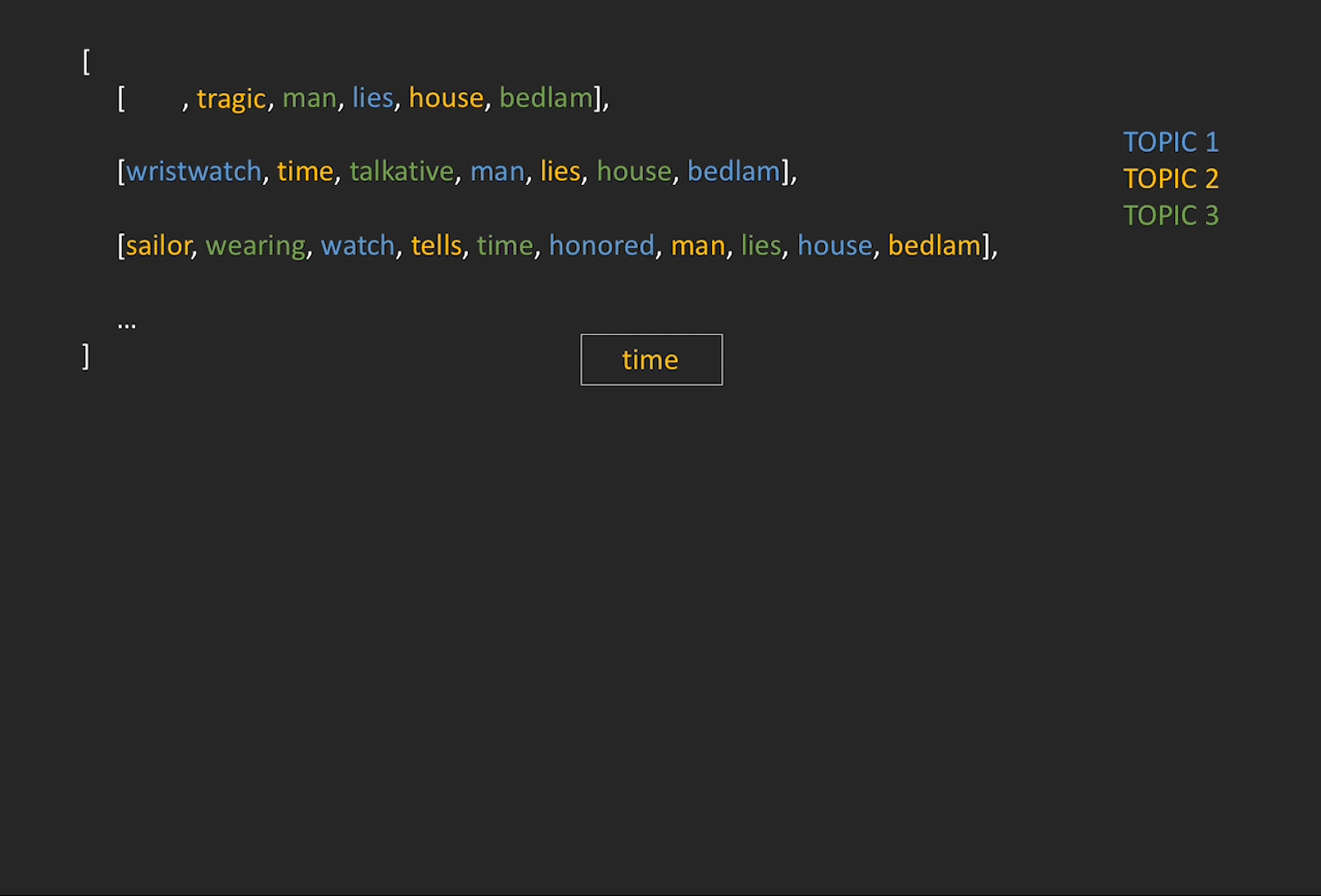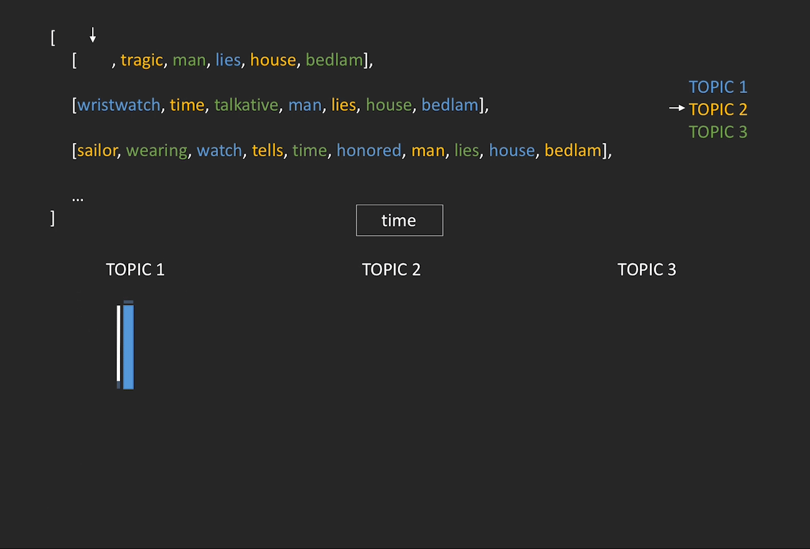 The topic assignment is removed from one word at a time. The likelihood that the word is assigned to any given topic will then be calculated. Here, probability of assignment is represented as the area of a 2D graph.