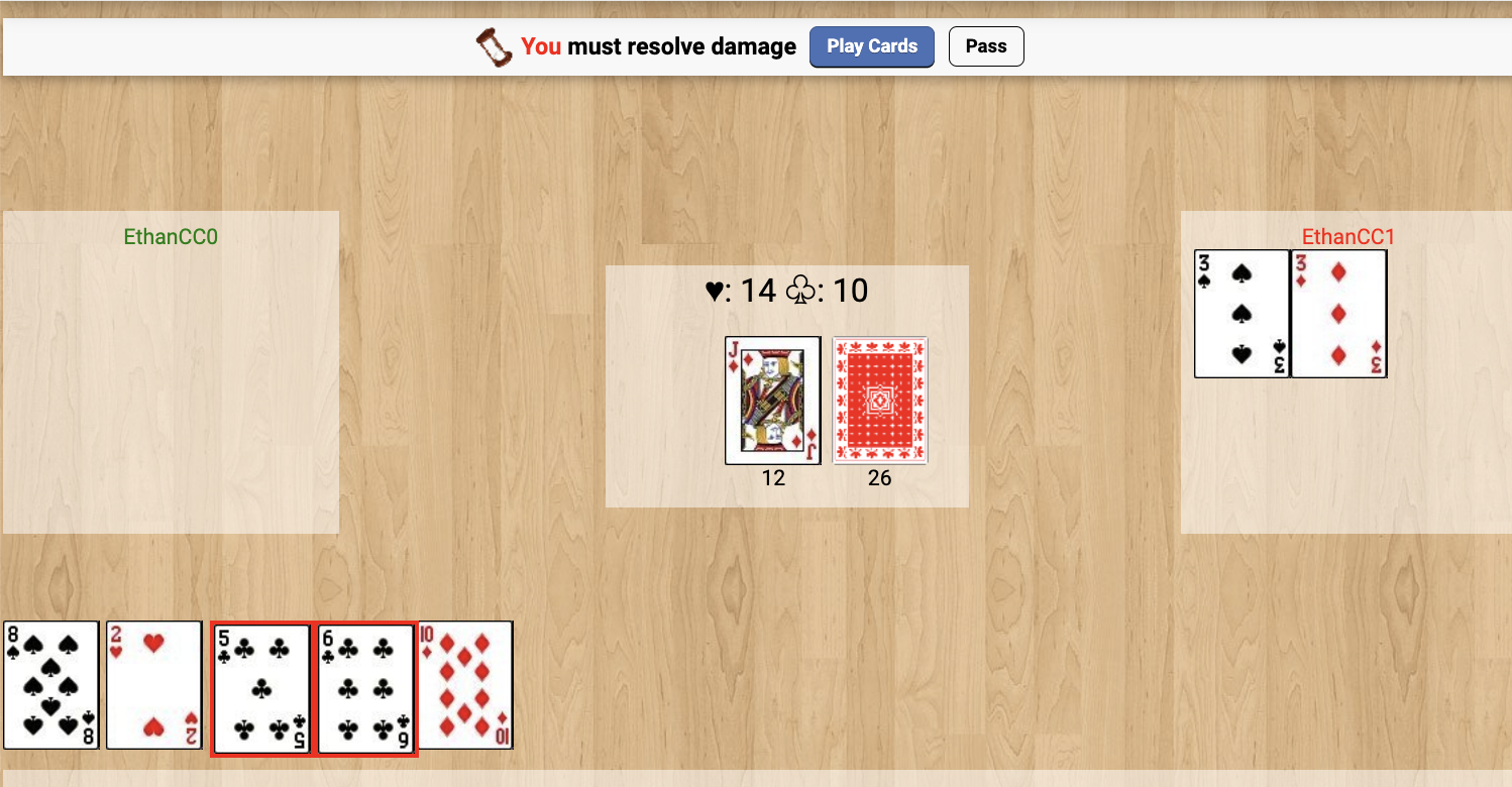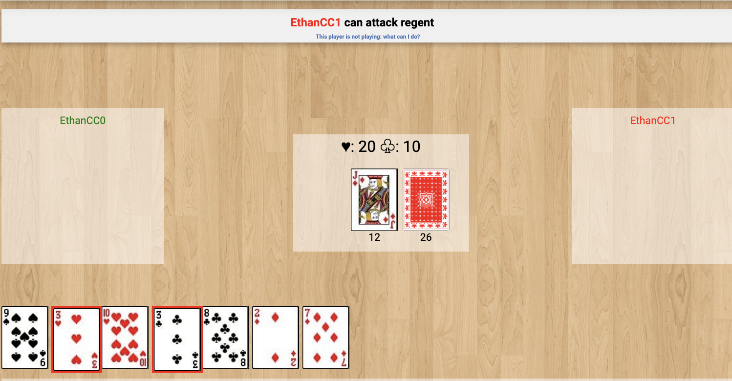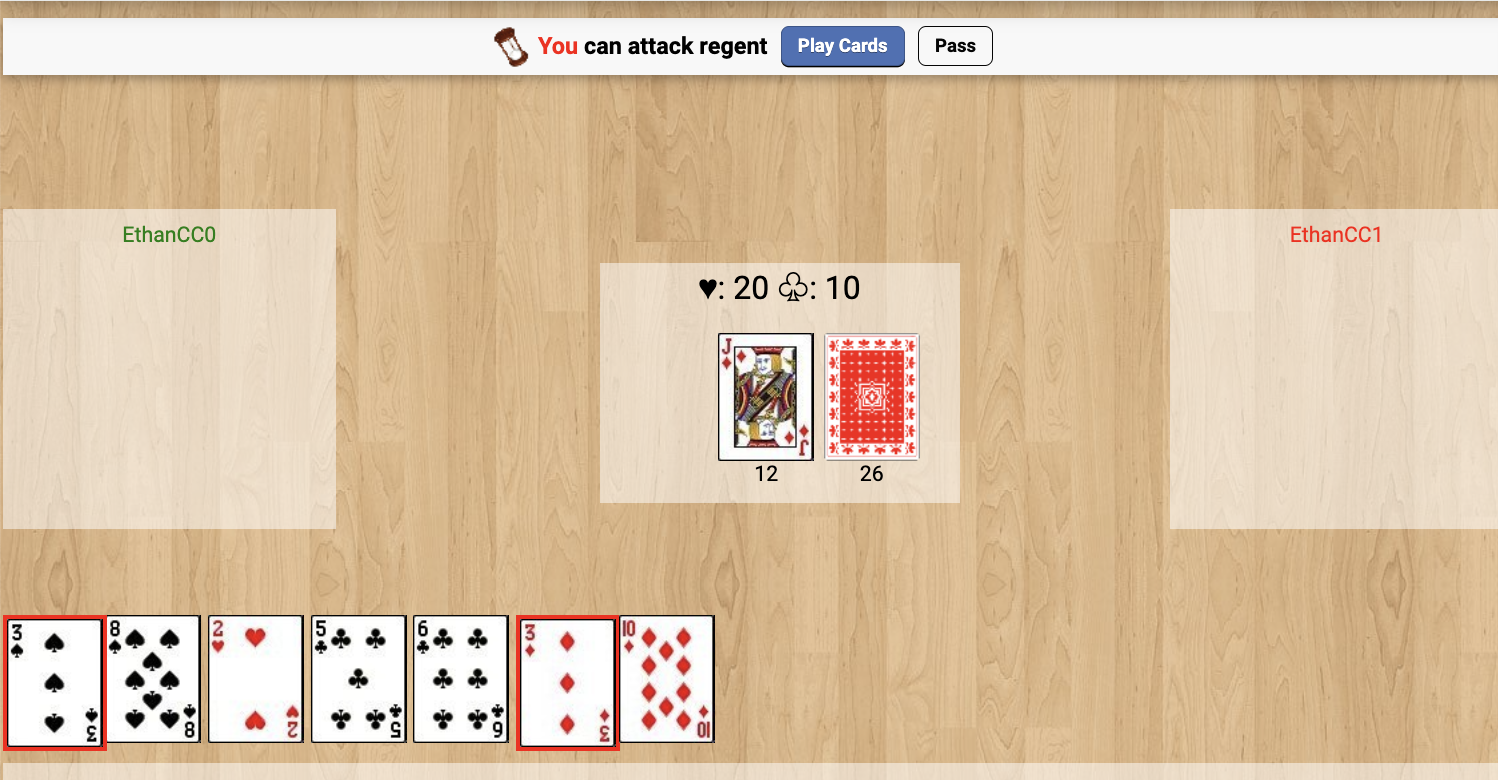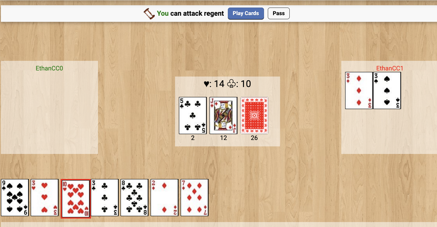 Ethan made Regicide in BGA. Becasue there is a version of this game existing on the BGA website, the original game art is not used to respect publisher IP. Learn more about it here. It utilizes various BGA libraries and the State machine in this implimentation. Uses HTML, CSS, javascript, PHP, and SQL