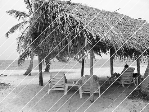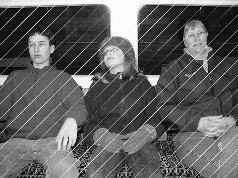 P itself plus the eight surrounding pixels.P.The left image below is a gray version of an image, with some artificial scratching added to it. Using the median filter described above, with radius-1 square neighborhoods, we get the image on the right. At the cost of a bit of blurring and flattening of the grays, we have nearly eliminated the severe damage of the diagonal scratches.