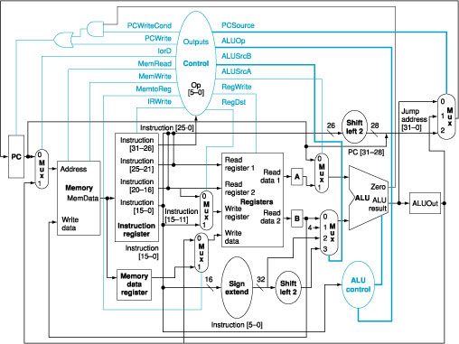 (8 points) Still using Figure 5.28, suppose the propagation delays of the various elements are: 15 ns for memory, 18 ns for the ALU, 3 ns for the registers, 4 ns for the Control, 4 ns for the ALU Control, 2 ns for each of the multiplexors, 1 ns for the shift left, 1 ns for the sign extend, and 1 ns for individual gates. Also, assume that the memory elements IR, PC, A, B, Memory data register, and ALUOut show the proper output 1 ns after the trailing clock edge (assuming the appropriate write-enable lines are set).