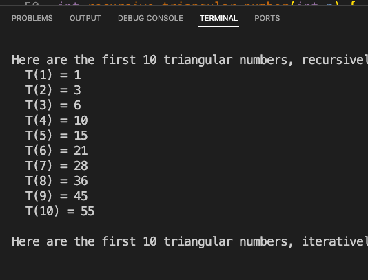 - Add a call to recursive_triangular_number(10) and a print statement to print out its result