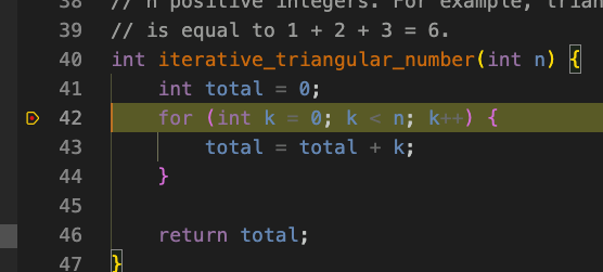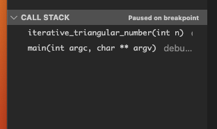 - Keep going until you're at the line in main iterative_triangular_number(2) is about to be called. Now, instead of clicking Step Over, click the Step Into button.