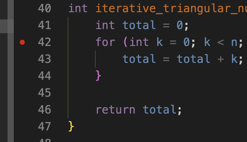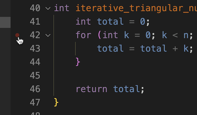 Set a breakpoint. Once you have a copy of debug_this.c open in VS Code, scroll down to the function iterative_triangular_number. At the line with the for-loop, hover your mouse to the left of the line number. You will see a ghost of a red dot. Click to make that red dot solid.
