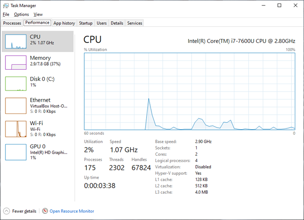 How can you tell whether your Windows 10 machine supports virtualization? Right-click on the task bar (the bar on the bottom of the screen) and select Task Manager. Then select the Performance tab. Look in the bottom right of the Performance screen: