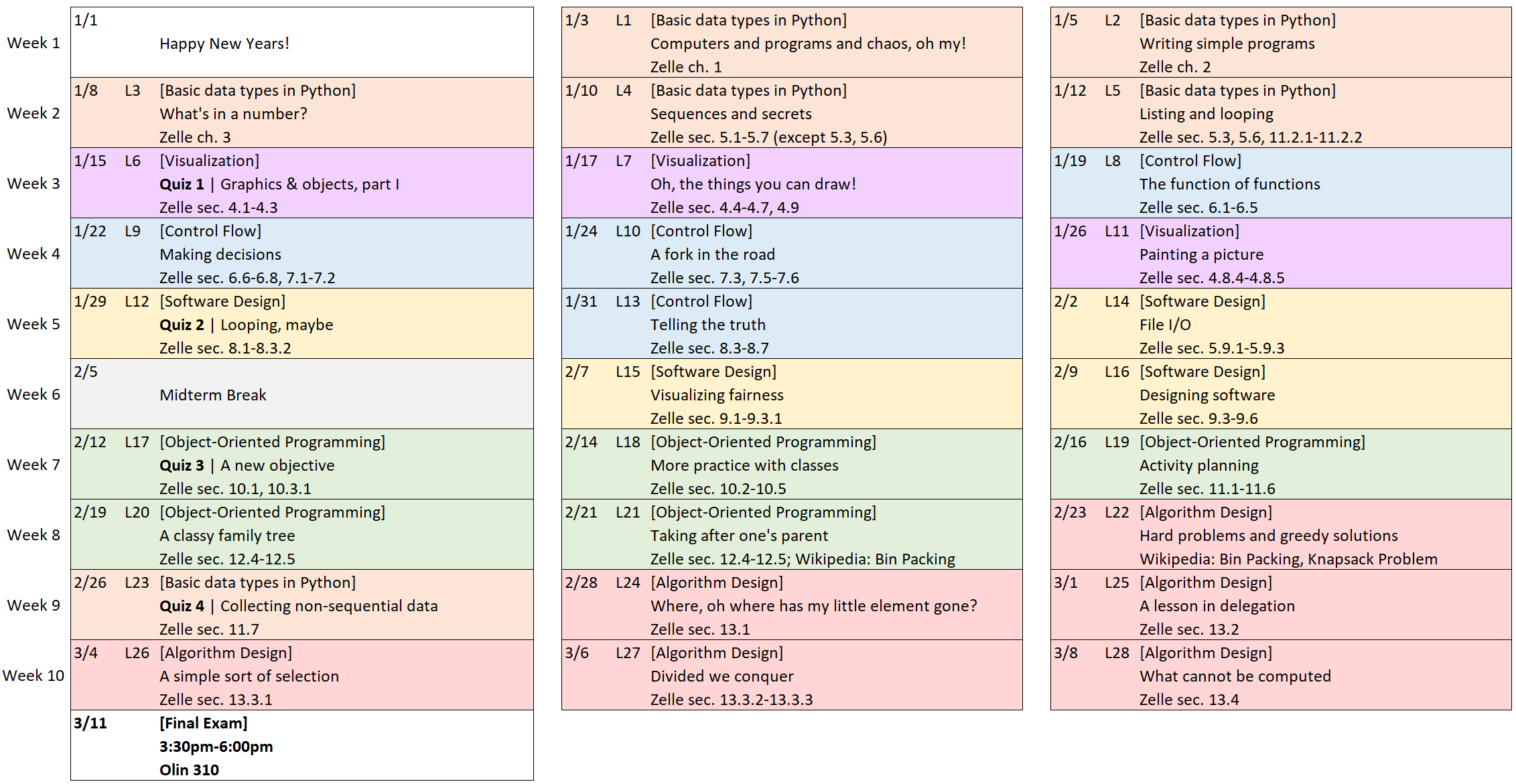 - Final: Monday, March 11th (3:30pm-6:00pm in Olin 310)